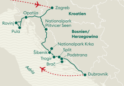 Entdecken Sie Kroatien von seiner schönsten Seite: Von der lebendigen Hauptstadt Zagreb über das römische Erbe in Pula bis zu den beeindruckenden Nationalparks mit türkisfarbenen Seen und Wasserfällen. In Split erwartet Sie der Diokletianpalast, in Dubrovnik die weltberühmte Altstadt mit Blick aufs Meer. Eine Reise voller Geschichte, Natur und mediterranem Flair.