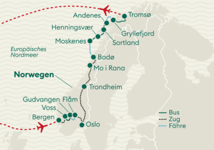 Heute fahren Sie den zweiten, kürzeren Abschnitt der Nordlandbahn und überqueren dabei den nördlichen Polarkreis – ein besonderes Reiseerlebnis! Gegen Mittag erreichen Sie Bodø. Auf der gesamten Strecke der Nordlandbahn haben Sie mehr als 290 Brücken passiert und über 150 Tunnel durchquert.