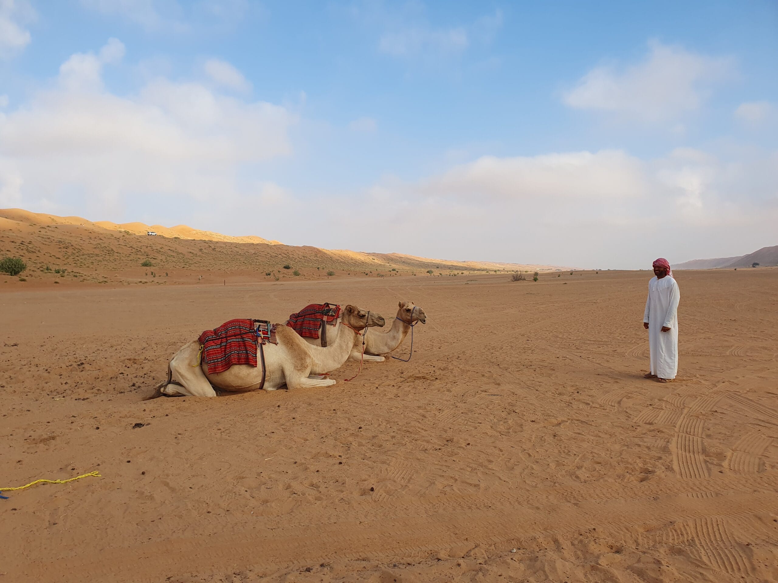 Heute erlebten wir das persönliche Highlight unserer Reise: die Fahrt in die Wahiba Sands. Auf dem Weg dorthin hielten wir zunächst bei einer traditionellen Dhow-Werft, wo wir den Handwerkern zusahen, wie sie die typischen arabischen Schiffe und Möbel kunstvoll von Hand fertigen. Weiter ging es zum Wadi Bani Khalid, einer malerischen Oase, wo wir eine kurze Erfrischungspause einlegten und die Gelegenheit für eine Limonana natürlich nicht ausliessen konnten. Kurz vor der Wüste liessen wir die Luft aus den Reifen der Geländewagen und die abenteuerliche Fahrt in die beeindruckenden Dünen der Wahiba Sands begann. Dort erlebten wir einen spektakulären Sonnenuntergang und genossen später ein köstliches Abendessen im wunderschönen Desert Nights Camp.