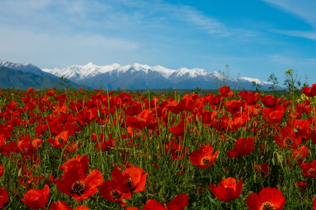 Rund um den Yssiköl-See ein Spektakel an herbstlichen Farben: Pappeln, Aprikosen- und Apfelbäume färben die Landschaft orange. Im Sommer sind die Weiden mit Mohnblumen überzogen. Höher in den Bergen wachsen Enzian und Edelweiss. Botanisch hat das Land aber noch mehr zu bieten: Kirgisistan verfügt über die grössten Nusswälder der Welt. In diesen tummeln sich Hirsche, Wildschweine, Luchse und Wölfe. Auch Bären ziehen durch das Land. 80 Prozent der
