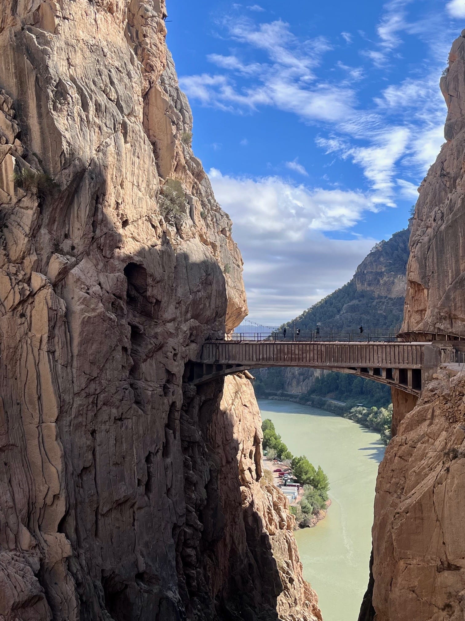 Endlich stand der Caminito del Rey auf dem Programm. Trotz der drohenden Regenwolken klarte es auf, als wir starteten. Der schwindelerregende, aber gut gesicherte Pfad führte uns durch die beeindruckende Schlucht und endete mit einer Hängebrücke, die im heftigen Wind wackelte, die Nerven nochmals testete und uns die Helme festhalten liess.